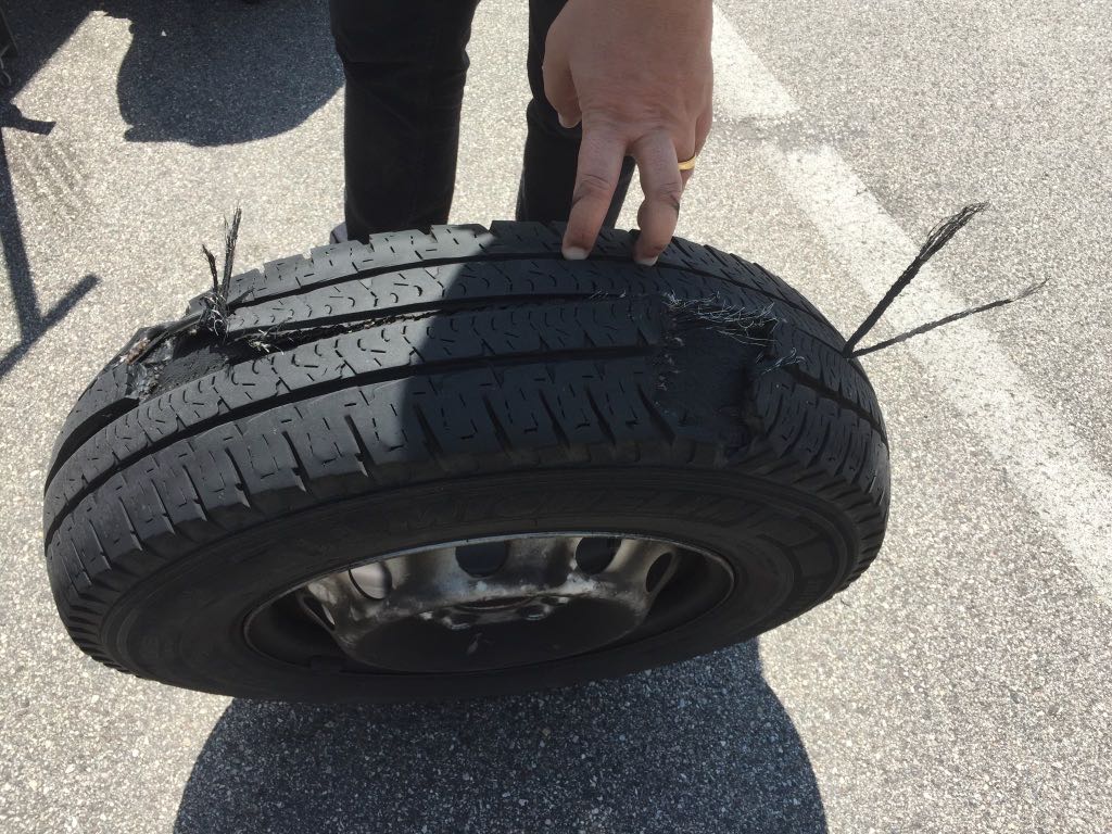 Defekter Wohnmobilreifen auf der Autobahn Richtung Gardasee