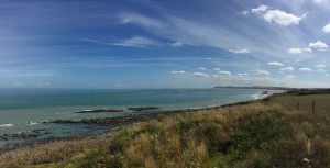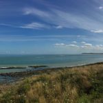 Überall an der Côte d’Opale lässt es sich wunderschön von einem kleinen Ort zum anderen laufen. Wir haben uns als Ausgangspunkt für das Cap Gris-Nez entschieden. Dort verläuft ein schöner Küstenwanderweg in beide Richtungen. Auf der einen Seite kann man sogar über 27 km weit immer an der Steilküste und an den Stränden in Richtung Calais entlanggehen. Wir haben beide Seiten von Cap Gris-Nez erkundet. Erstaunlicherweise sind sie landschaftlich nicht gleich. Sie unterscheiden sich doch erheblich voneinander. Die erste Route führte uns nach Wissant (ca. 6 km einfach). Das liegt ungefähr in der Mitte der Wissant Bucht. Diese wiederum wird begrenzt durch das Cap Gris-Nez auf der einen und das Cap Blanc-Nez auf der anderen Seite. Durch diese privilegierte Lage zwischen zwei Küsten bietet sich eine Vielfalt von Lebensräumen. Es gibt Dünenlandschaften, fossile Kliffe und eine Sumpflandschaft im Küstenhinterland zu sehen. Die Küstenlandschaft selbst findet sich in ständiger Bewegung. Gut zu sehen ist das bei Ebbe, wenn die von den Meeresströmungen geformte Sandbank sichtbar wird. Sie schützt das Watt vor den Wellen und ermöglicht damit den Anbau der Bouchot-Miesmuscheln. Der Weg selbst ist auch sehr abwechslungsreich. Er führte uns an der Steilküste entlang, über den harten Strand bei Ebbe und auf sandigen und anstrengend zu laufenden Dünenwegen. Immer wieder mit tollen Ausblicken auf die lang gezogene Wissant Bucht. Es war eine herrliche Küstenwanderung ganz nach unserem Geschmack.