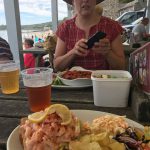 Ob man es glaubt oder nicht, das Pub in Porth Dinllaen an der Mitte der Westküste der Halbinsel Llyn ist nur zu Fuß nach einem kleinen Marsch zu erreichen. Das hält jedoch niemanden von einem Besuch ab. Es ist besonders an schönen und sonnigen Tagen rappelvoll. Des Rätsels Lösung ist seine Lage. Das Pub liegt nämlich direkt am Strand mit tollem Ausblick auf die Bucht und das Bergpanorama des Snowdon Nationalparks. Es ist entweder unten über den Strand zu Fuß in 20 Minuten erreichbar. Oder oben an der Steilküste über den dort angelegten Golfplatz. Frequentiert wird es nicht nur von den sonnenhungrigen Badegästen des Strandes, sondern auch auf von vielen Spaziergängern. Nach einer Stärkung im Pub gehen sie an der Küste noch ein Stück den Küstenpfad weiter. Die Lage des Pubs und natürlich auch unser Hunger haben uns zu einem Mittagessen dort verführt. Wir mussten dabei feststellen, dass die Engländer bzw. in diesem Fall die Walisen sehr erfindungsreich sind, was die Beilagen bzw. Garnitur eines Essens angeht. Chips, das Grundnahrungsmittel, darf dabei natürlich nicht auf dem Teller fehlen. Das Essen war ganz ok. Trotzdem haben wir festgestellt, dass wir ein Essen im Pub nicht so schnell wiederholen müssen. Die eigene Bordküche sagt uns dann doch mehr zu.