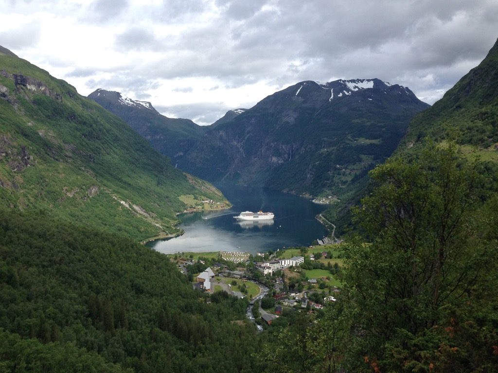 …mit Kreuzfahrtschiff vom Aussichtspunkt Flydalsjuvet