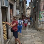 Im inneren von Korčula Stadt findet man ein Gewirr von schmalen Gassen. Diese gehen praktischerweise rechts und links von der Hauptgasse ab. In den mit altem und blank gescheuerten Kopfsteinpflaster ausgelegten Gassen findet man die typischen Geschäfte mit den immer gleichen Touristen-Andenken die es überall auf der Insel zu kaufen gibt. Nicht zu vergessen eine ganze Batterie an Restaurants. Diese finden sich in erster Linie zuhauf an der rechten Stadtmauer mit Blick auf das Meer.