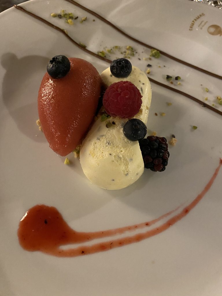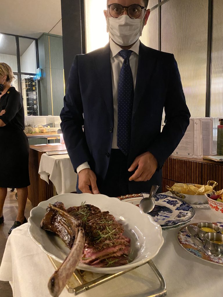 Das Tomahawk-Steak mit seinen 900 Gramm war mit seinen köstlichen Rostaromen unglaublich zart. Es kam bereits abgelöst vom Knochen und wurde hauchdünn aufgeschnitten serviert. Ein Genuss sonders gleichen. Bei der Menge an Fleisch hatten wir zur Zweit allerdings ganz schön zu kämpfen. Am Ende haben wir den Kampf dann aber doch noch gewonnen. Und für einen Nachtisch war dann schließlich nach einer kurzen Pause auch noch Platz.