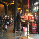 Am Buckingham-Palace in London oder am Königspalast in Kopenhagen befindet sich vor der Statue eine Ehrenwache in schmucker Uniform. Um 15:00 Uhr findet täglich die Wachablösung statt, die auch hier eine Vielzahl von Schaulaustigen anzieht. Ausländische Touristen bzw. „Langnasen“ konnten wir –außer unserer kleinen Reisegruppe- keine ausmachen. Ob es sich um bei den Umstehenden alles um Taiwanesen oder andere Asiaten handelte, hat sich uns nicht erschlossen. Sie waren auf jeden Fall alle sehr diszipliniert und verhältnismäßig leise. Die Wachablösung selbst ist wirklich sehenswert – ein Spektakel zwischen rhythmischer Sportgymnastik und Ballett. Es war wirklich nett anzusehen und sehr amüsant. Es dauerte eine gefühlte Ewigkeit, bis die wachhabenden Soldaten in einer aufwändigen Choreographie auf ihren Plätzen ausgetauscht waren. Leider war die Besichtigungszeit sehr knapp bemessen und bot nur die Möglichkeit kurz in die einzelnen Räume hinein zu schnuppern. Wir hätten dort gerne noch mehr Zeit verbracht, da wir es wirklich sehr interessant fanden. Gerne wären wir auch noch im Garten umhergestreift oder hätten uns das Nationaltheater und die Nationalkonzerthalle angesehen, die sich auf dem gleichen Gelände befinden. Aber als nächstes Ziel wartete bereits der Longshan Temple auf und uns. Dieser ist im Wanhua District gelegen. Er wurde 1738 gegründet und ist Guanyin gewidmet, der buddistischem Göttin des Erbarmens und der Gnade. Das wir uns im Jahr des Affens befinden, war sogar für uns Laien auf den ersten Blick ersichtlich. Überall hingen kunstvolle Lampions in Affenform und auch der Tempel innen war mit einer Vielzahl dieser sehr kreativen Lampions dekoriert. Die Tempelanlage ist geteilt in eine Vorhalle, Haupthalle, hintere Halle und einem rechten und linken Flügel. Alles sehr kompakt gebaut. Unser Guide hat uns noch einiges an Informationen zum Glauben und den Bräuchen im Tempel mitgegeben. Eine wirklich faszinierende Angelegenheit. Der Tempel selbst ist wunderbar ausgeschmückt. So finden sich z.B. auf dem Dach wunderbar kunstvoll gestaltete Drachen. Ich konnte mich daran gar nicht satt genug sehen. Zum Zeitpunkt unseres Besuches fand gerade ein „Gottesdienst“ statt. Es war schon sehr berührend zu sehen, wie intensiv die Tempelbesucher in Ihrer Zwiesprache versunken sind. Wir konnten uns sehr frei im Tempel bewegen und keiner hat von uns Kenntnis genommen oder uns angesprochen. Die Menschen aus Taiwan scheinen in dieser Beziehung sehr zurückhaltend zu sein. Unweit der Tempelanlage befand sich der Touristenmarkt. Es handelt sich dabei um eine lange überdachte „Straße“, in der sich eine Vielzahl von Restaurants, Fusspflege und Fußmassagesalons befinden. Vereinzelt finden sich auch noch Schuh- und Kleiderläden. Von Touristen am Nachmittag keine Spur. Dagegen besuchten die Taiwanesen sehr rege die Fußmassagesalons deren Sessel wirklich keine Wünsche offen ließ. Sogar Fernseher gab es daran zu sehen. Fußmassage scheint ein Volkssport in Taiwan zu sein.